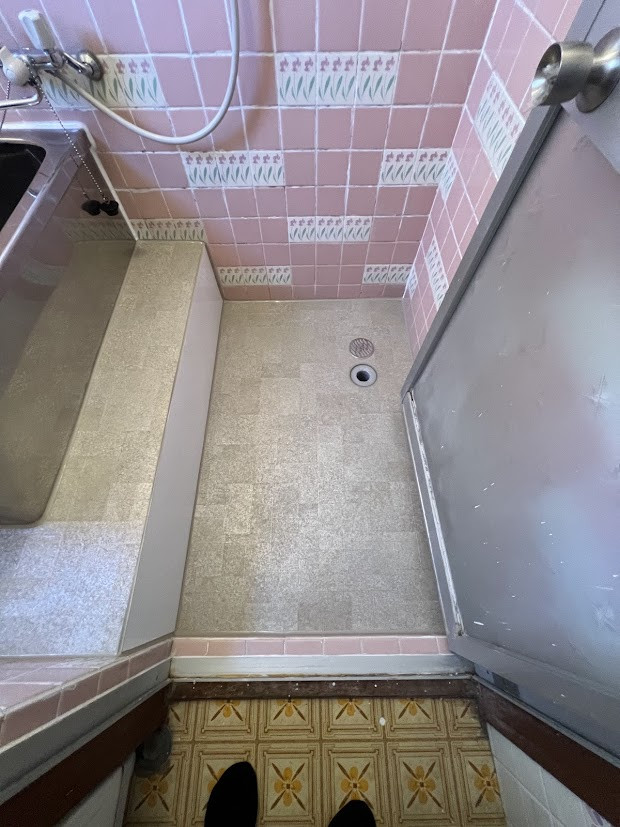2階浴室の床割れが原因で、1階の動物病院へ漏水する可能性があるとのご相談。 床のクラックを補修したうえで、防滑性の高い浴室用シートを施工し、安全性と防水性を強化しました。